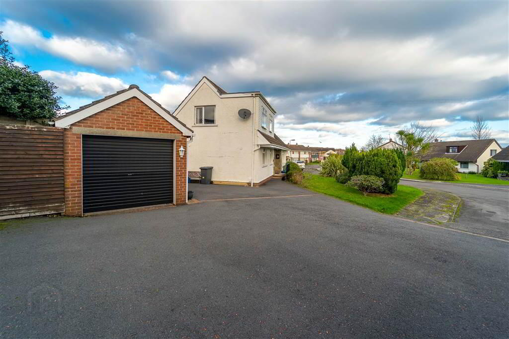 To the front of the Property there is a large Driveway providing off Road Parking for multiple Vehicles, a Garden in Lawn and small Trees and access to the detached Garage.
