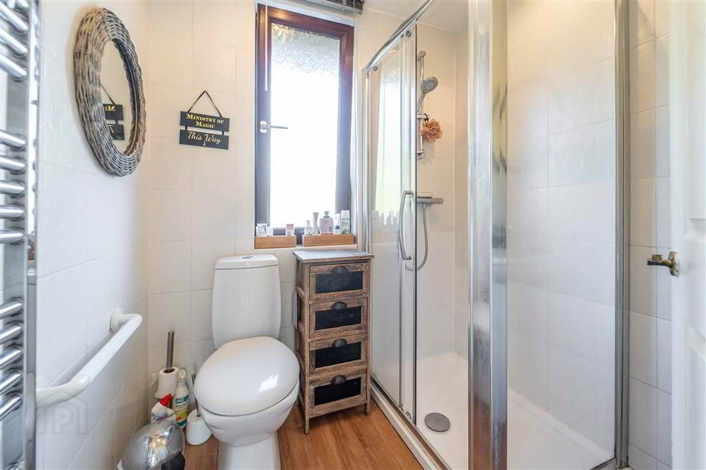 - White three-piece suite comprising a Push Button W.C., a Shower Cubicle with Mains Shower and a Wash Hand Basin. Complete with tiled walls.