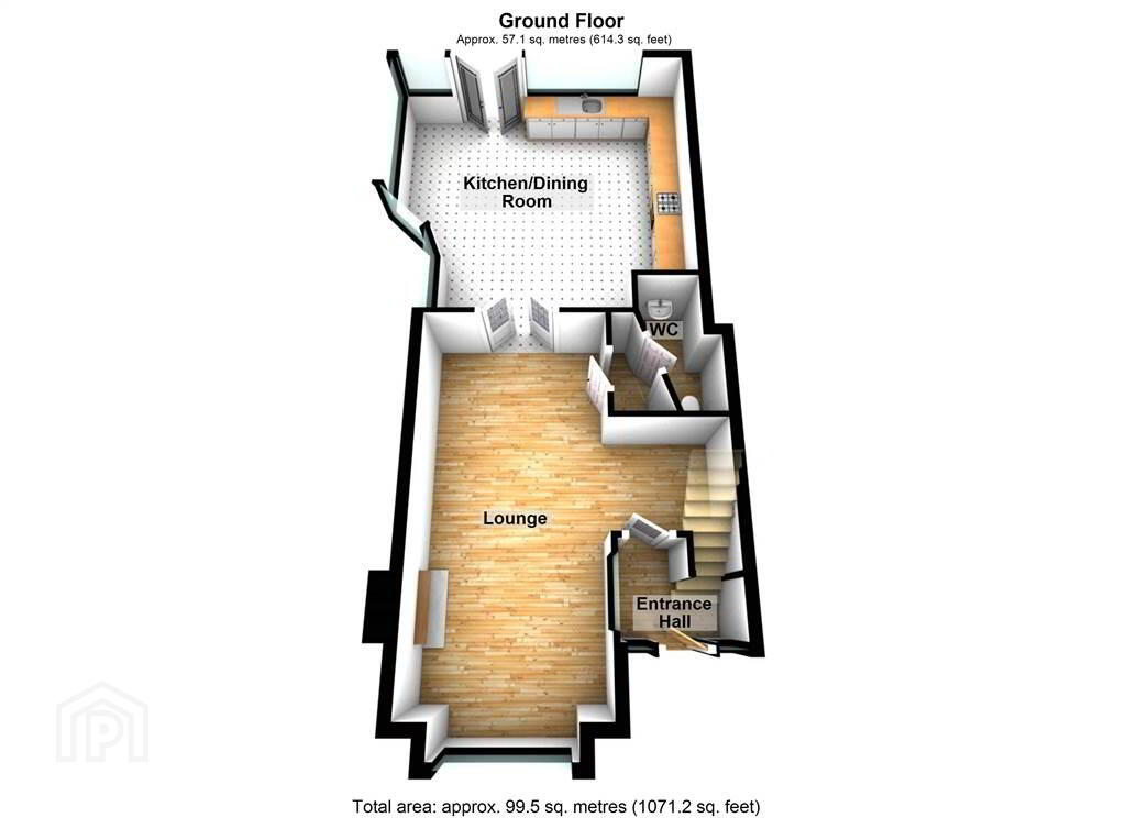 Modern fitted Gloss Kitchen with an excellent range of high and low level units and complimentary Worktops. Integrated appliances include a Dishwasher, Dual Oven, a Hob and a Stainless Steel Sink Unit. Complete with Laminate Wooden Flooring. Provides ample space for dining and panoramic windows overlooking the Rear Garden. - W.C.: