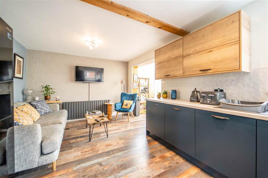Front aspect Reception with a feature slate tiled Fireplace with Wooden Mantel. Complete with Wooden Flooring. - KITCHEN / DINING: