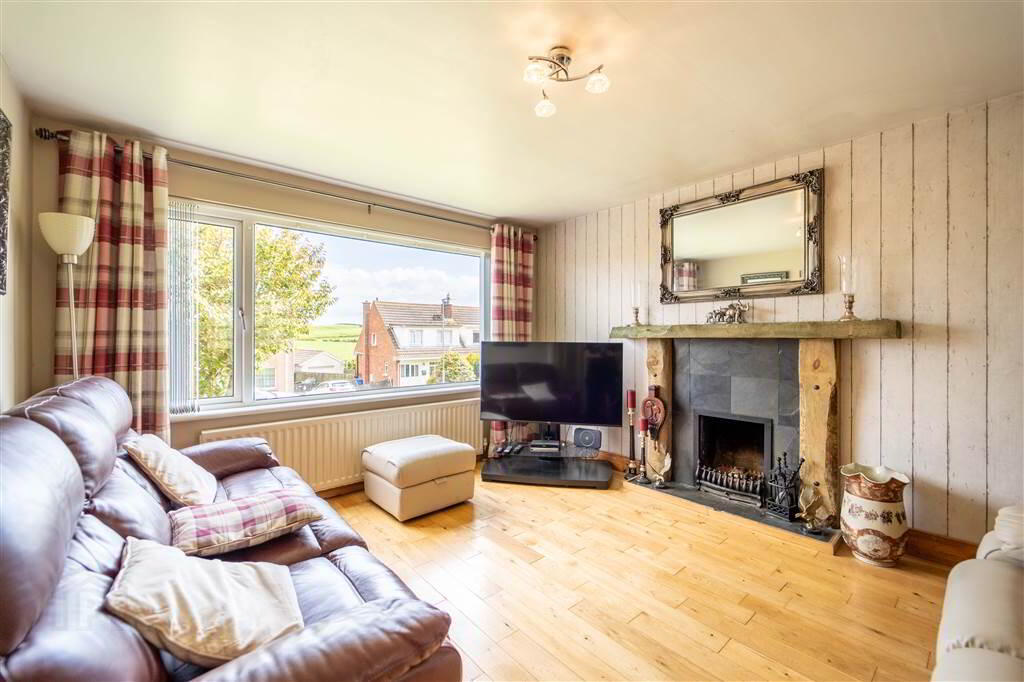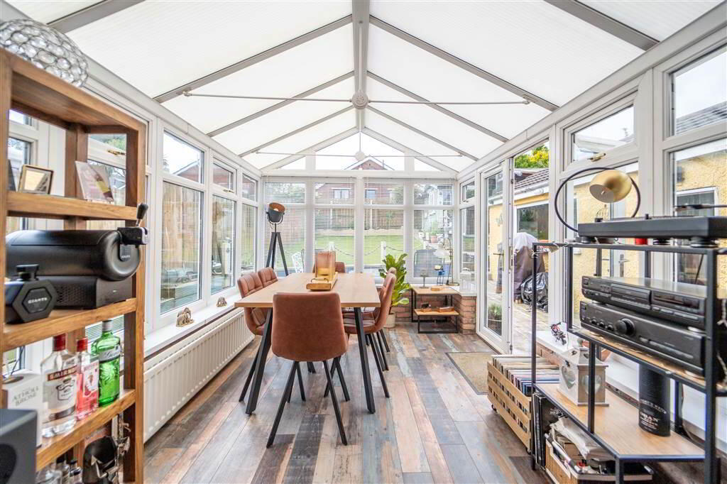 Accommodation on the Ground Floor of the Property comprises a spacious Lounge with a feature Fireplace and a contemporary styled fitted Kitchen, with ample space for dining, which in turn leads through open plan to the Conservatory.