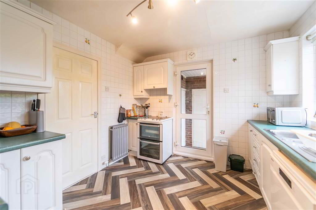 Fitted Kitchen with a range of high and low level units with complimentary laminate roll-edge Worktops. Door leading to the raised Patio Area and Rear Garden.