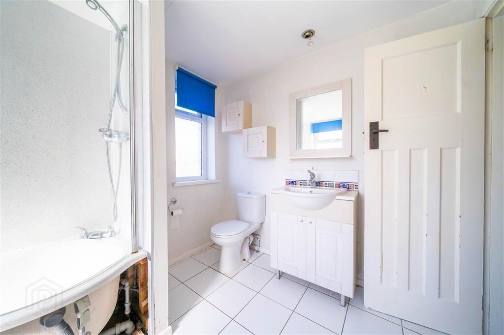 White three-piece suite comprising a Bath with Shower Attachment, a Push Button W.C. and a Wash Hand Basin with cupboard storage under. Complete with tiled flooring.