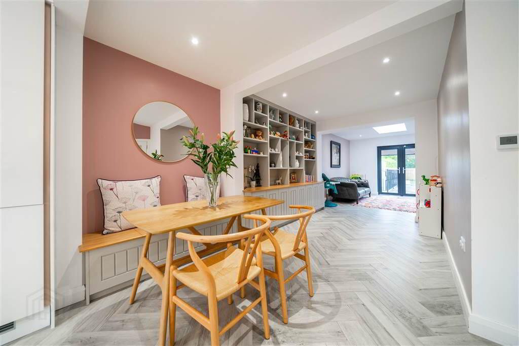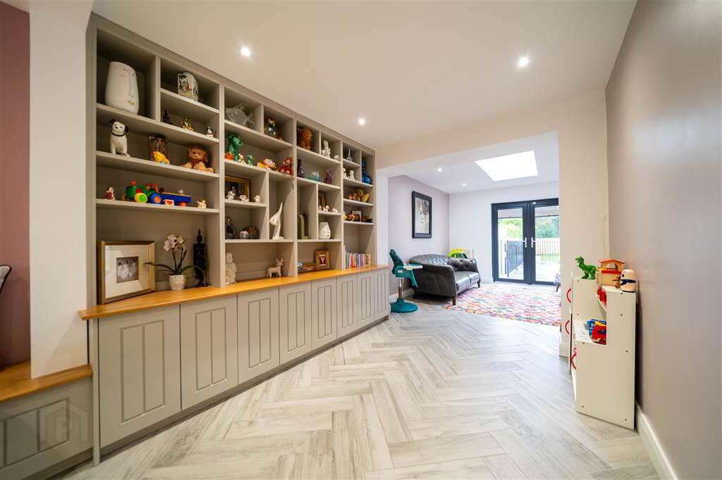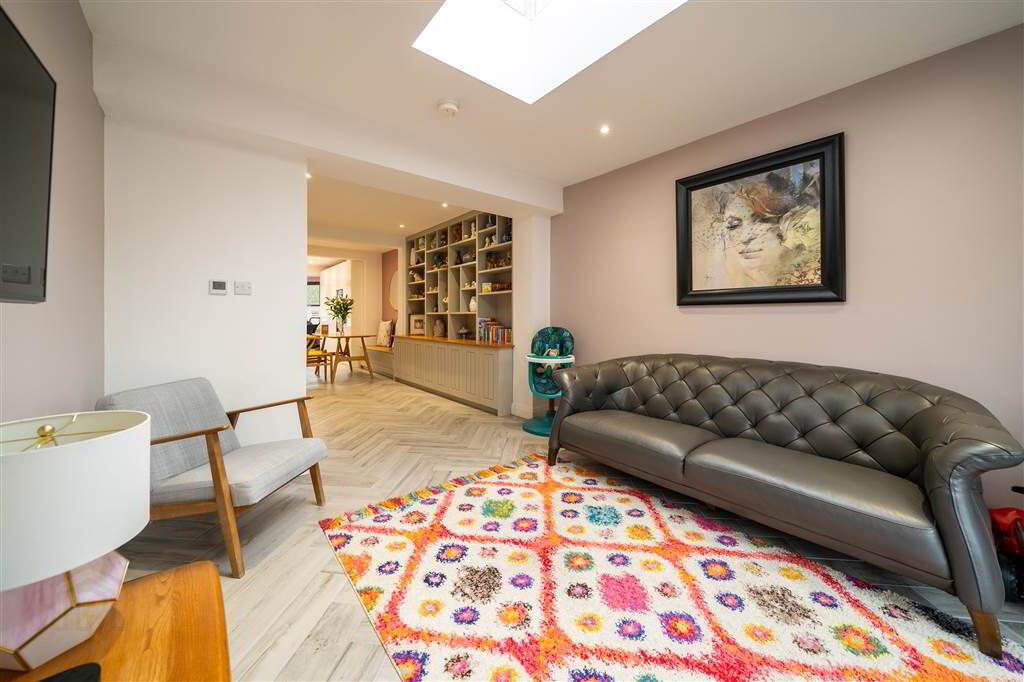 Rear aspect Reception Room with Herringbone Tiled Flooring, fitted Shelving and Storage, recessed Spotlights, a feature Rooflight and uPVC double Glazed Door provide access to the rear Garden. - BEDROOM (4):