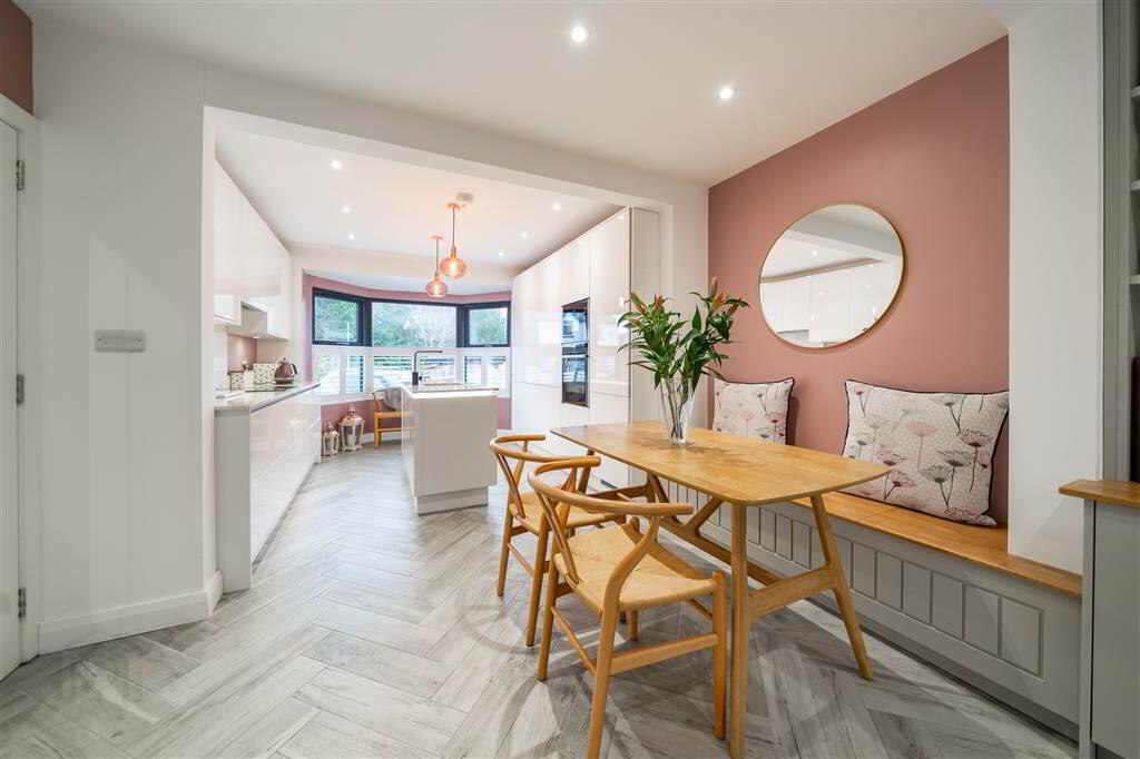 Complete with Herringbone Tiled Flooring, recesses Spotlights, built-in Storage and access to under Stair Storage which is Plumbed for a Washing Machine. - KITCHEN / DINING