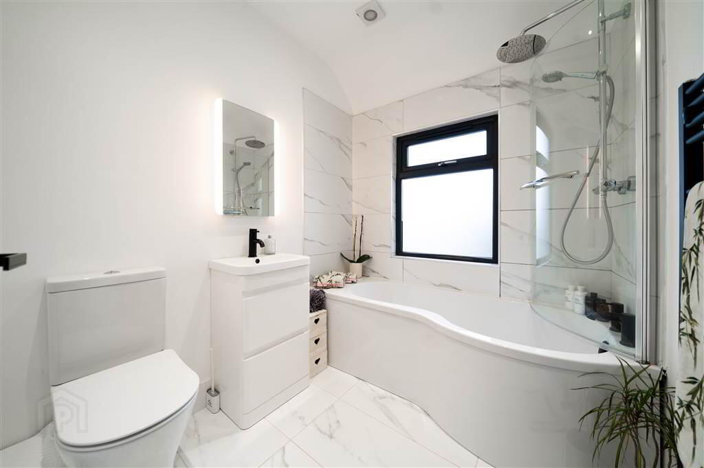 Deluxe three-piece Suite comprising a Bath with a Mains Rainfall Shower over, a Low Flush W.C. and a Sink with Storage under. Complete with Tiled Flooring, part Tiled Walls, recessed Spotlights, an Extractor Fan and a heated Towel Rail.
