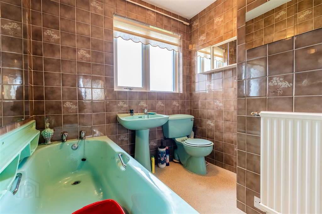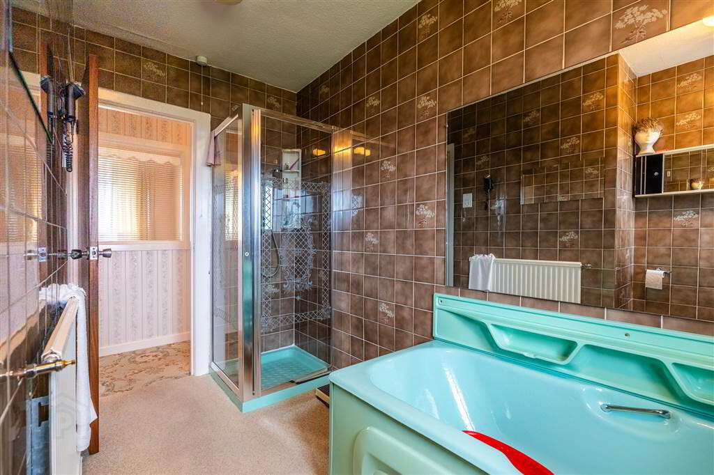 Four-piece suite comprising a tiled Shower Cubicle with Electric Shower unit, a Panel Bath, a Pedestal Wash Hand Basin and a W.C.. Complete with tiled walls.