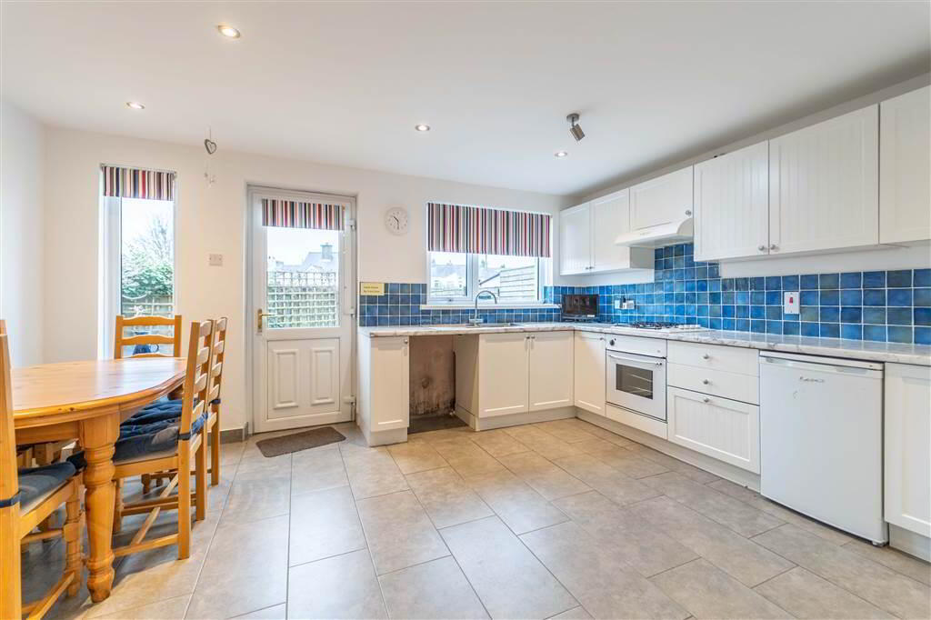 Fitted Kitchen with a range of high- and low-level Units with complimentary roller edge Worktops, a 1 & ½ Bowl Stainless Steel Sink and Drainer Unit, Plumbed for a Washing Machine, an Integrated Four Ring Gas Hob with Oven Under and Extractor over. Complete with Tiled Flooring, part Tiled Walls, recessed Spotlights, access to built-in Storage and access to the rear via a uPVC and Glazed Door.