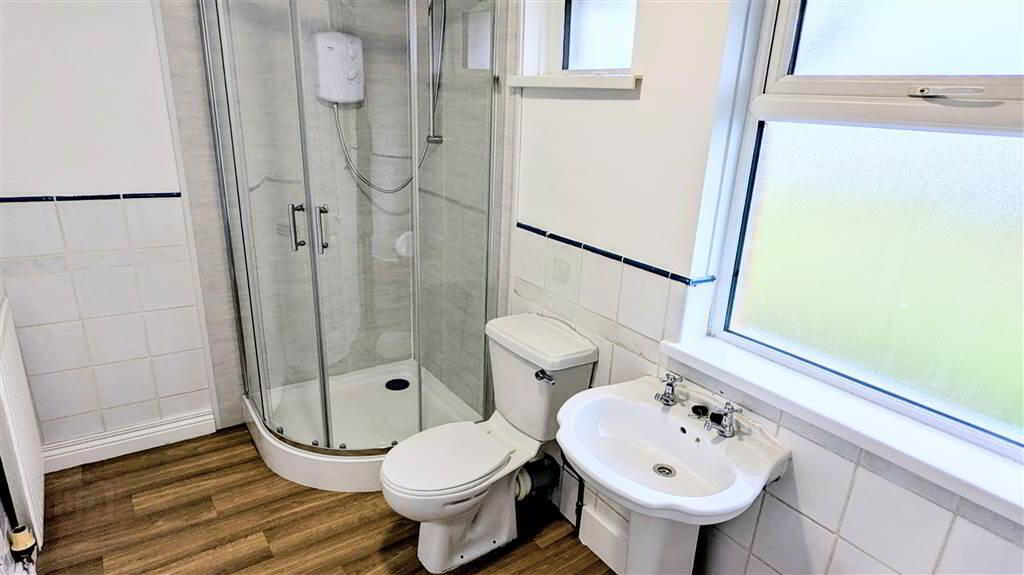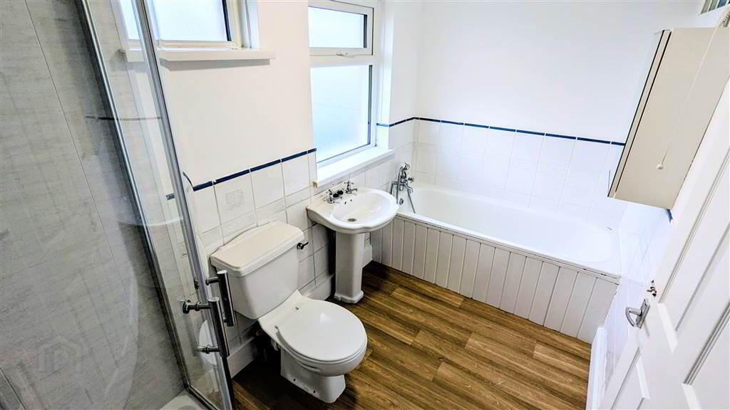 Four-piece suite comprising a W.C., a Pedestal Wash Hand Basin, a Bath and a Corner Shower Cubicle with Electric Shower Unit.