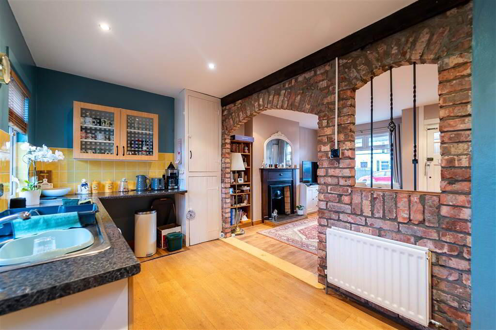Front aspect Reception Room comprising an open Fire with a Tiled Hearth, Surround and a Wooden Mantle. Complete with access to under Stair Storage and Laminate Wooden Flooring. An Archway provides access to: - KITCHEN: