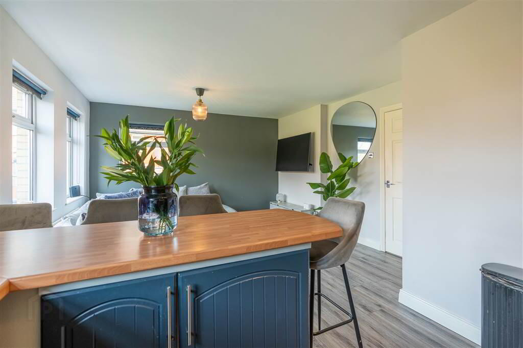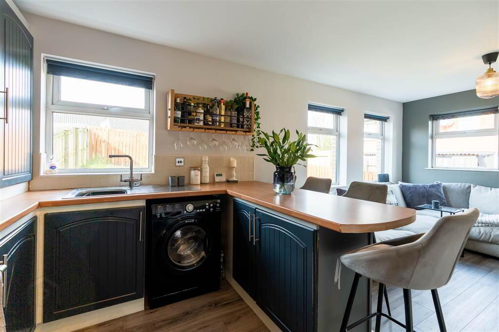 Modern fitted Kitchen, open plan off the Lounge with a range of high and low level units with complimentary Worktops extending into a Breakfast Bar dividing the Lounge to the Kitchen. Plumbed for a Washing Machine, complete with Laminate Wooden Floor and access to spacious understairs storage.