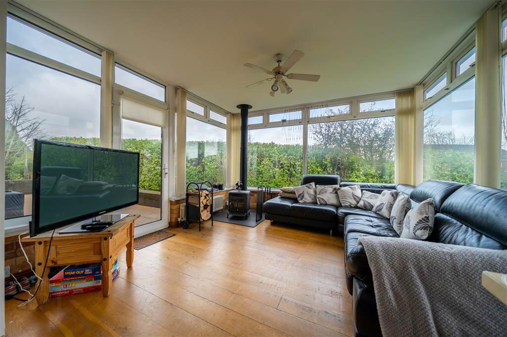 Rear aspect Sun Room, open plan from the Kitchen, with panoramic views over the rear lawn garden and a feature Cast Iron Stove. Dual access to the raised rear Patio Area. - UTILITY ROOM: