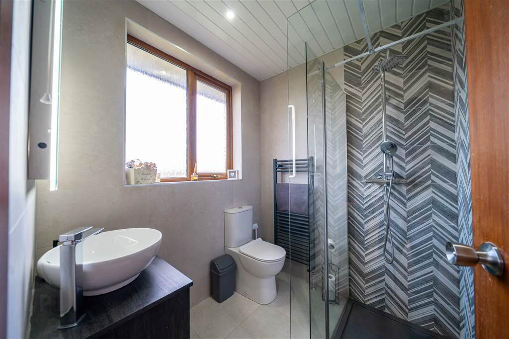 Recently fitted fully tiled deluxe Shower Room with a three-piece suite comprising a Push Button W.C., a tabletop Wash Hand Basin with cupboard storage under and a walk-in Shower Enclosure with mains shower. - BEDROOM (3):