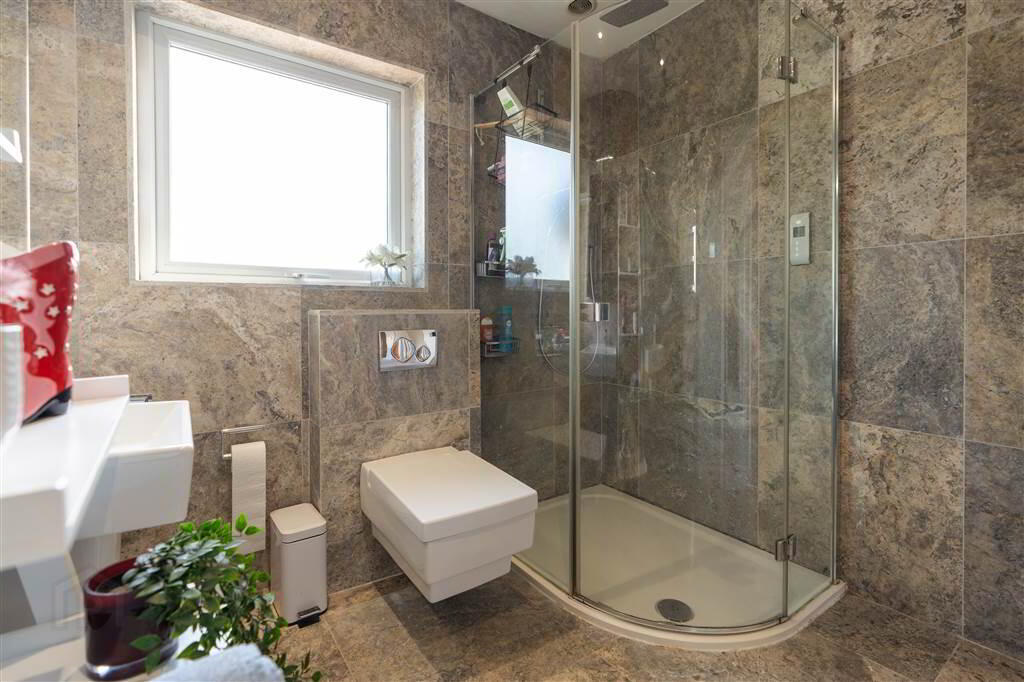 Contemporary styled deluxe fully tiled Shower Room with a four-piece suite comprising dual wall-mounted ‘floating’ Wash Hand Basins, a concealed cistern Push Button W.C. and a Corner Shower Cubicle with Mains Shower. Underfloor Heating.