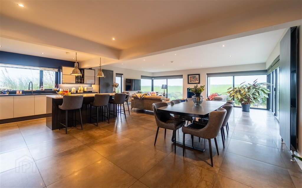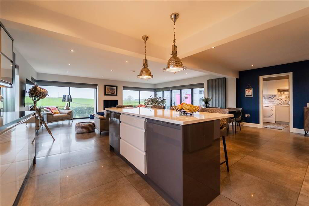 Luxury fitted high-gloss Kitchen, with complimentary Worktops and a matching Island Unit topped with Quartz. Integrated appliances include an Oven, a Hob and a Dishwasher. The Kitchen is open plan into an extended Living / Dining space, with a feature Cast Iron Multi-Fuel Stove which has been cleverly designed with multiple ‘full-length’ windows to enjoy the countryside views. Folding doors also lead to the Rear Patio Area creating an ideal place to relax or entertain. Tiled flooring throughout.