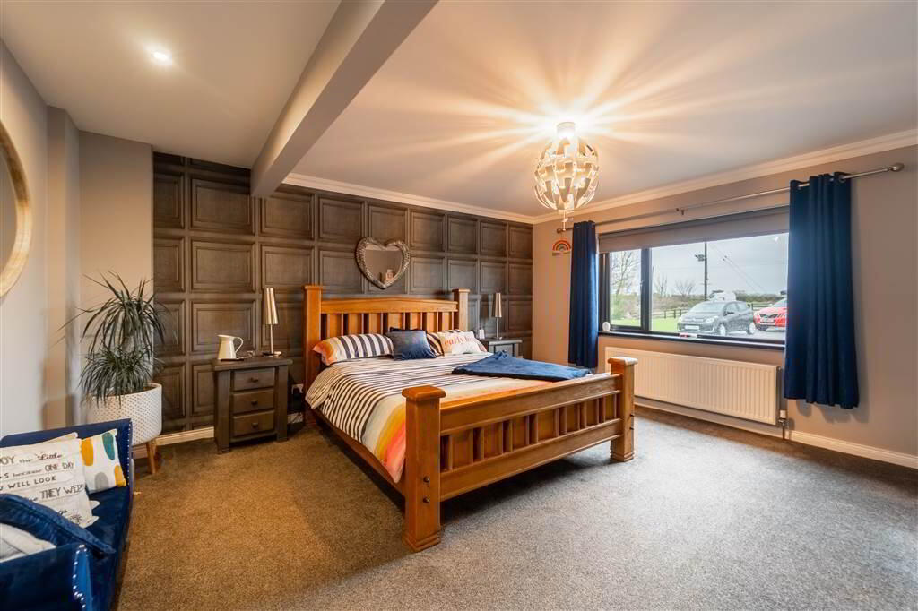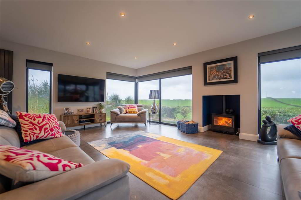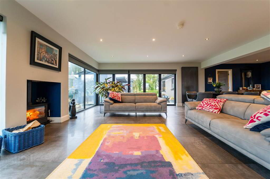 The Ground Floor, accessed via a spacious Entrance Hall – a room in its own right, leads through to the spacious Kitchen / Dining / Living Area. Cleverly designed and extended with panoramic windows to the rear, with a central feature stove, to capitalise on the countryside views on offer. A luxury fitted Kitchen, with a central island unit, completes this stunning area. Furthermore, folding doors lead from this area to the Rear Patio Area creating an enviable entertaining / relaxing space.