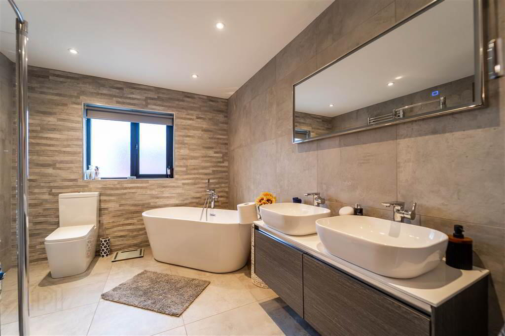 Deluxe fully tiled contemporary styled Bathroom with a four-piece suite comprising a free-standing double ended Bath, two table-topped Wash Hand Basins with drawer storage under, a Push Button W.C. and a walk-in Shower Enclosure.