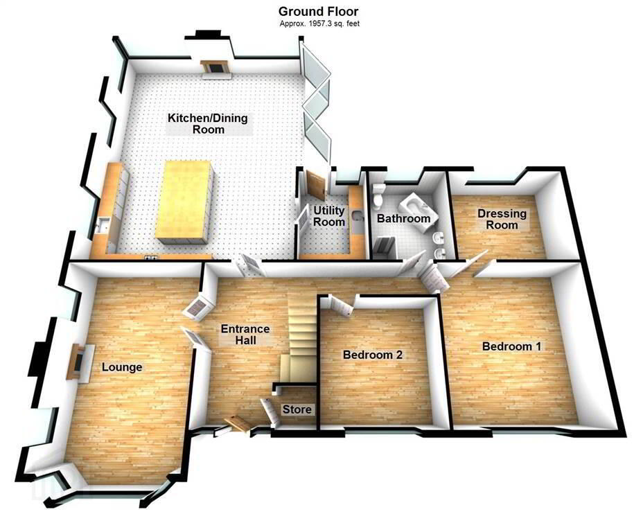 Accommodation on the Ground Floor continues with an additional Lounge with a feature Fireplace, two double Bedrooms (with the Principal Bedroom enjoying access to a spacious Dressing Room), a deluxe contemporary Bathroom Suite and a Utility Room off the Kitchen.