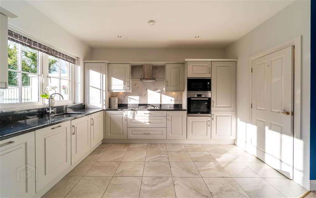 Modern fitted ‘Shaker’ style Kitchen with an excellent range of high and low level units with complimentary Worktops. Range of integrated appliances include a Fridge / Freezer, a Gas Hob, an Oven, a Microwave, a Washing Machine, a Dishwasher, a Wine Fridge and a Stainless Steel Sink Unit. The Kitchen opens to provide ample space for dining or a further reception space. Patio Doors lead to the Rear Garden.
