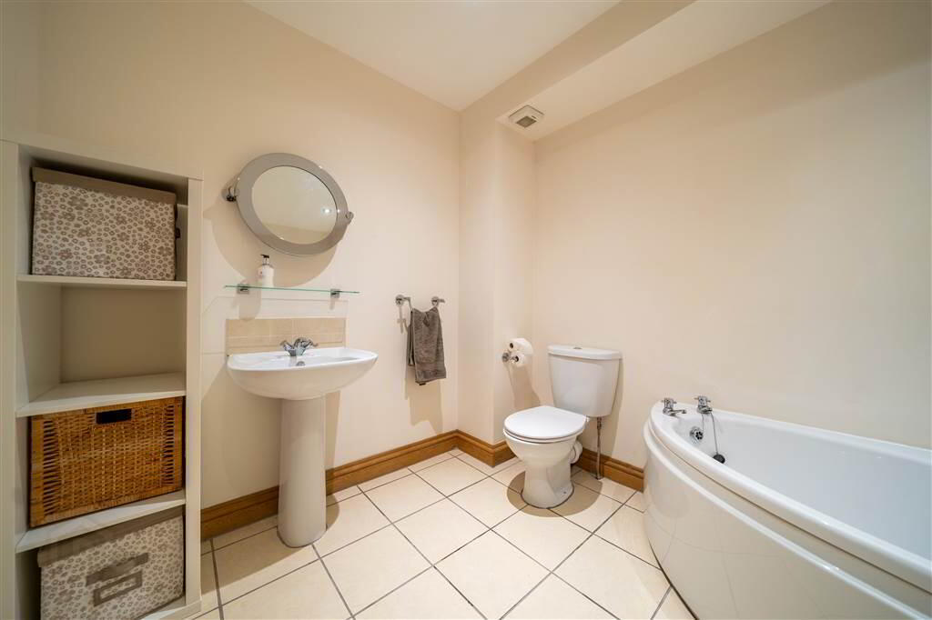 White three-piece suite comprising a Corner Bath, a Push Button W.C. and a Pedestal Wash Hand Basin. Complete with tiled floor.