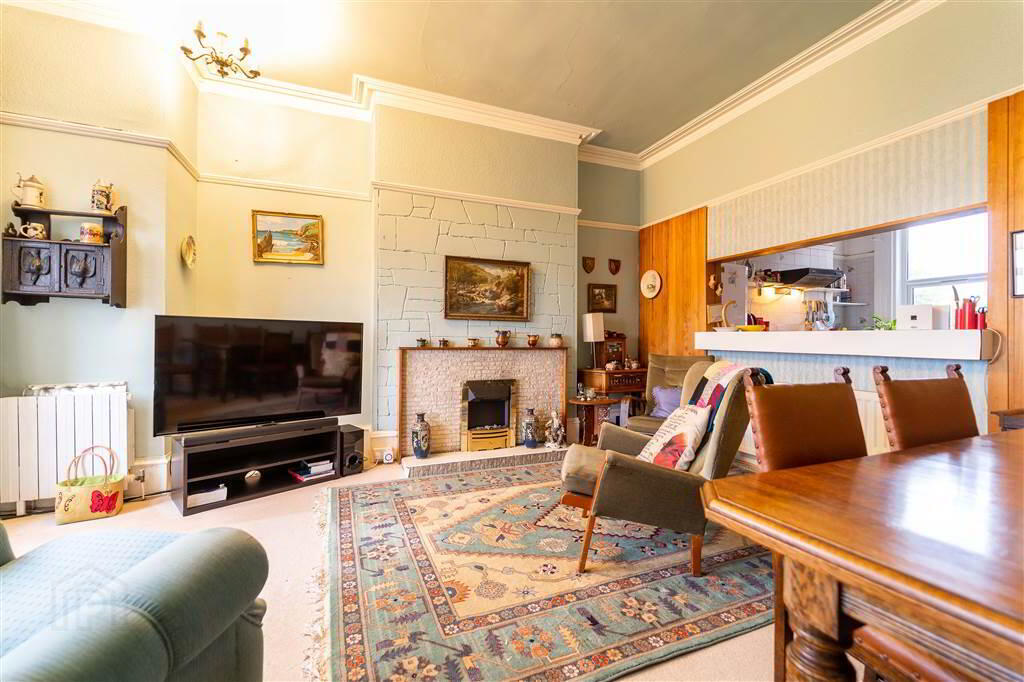 Into bay window affording sea views, period slate fireplace with inset cast iron open grate, cornice and picture rail. - LIVING ROOM: