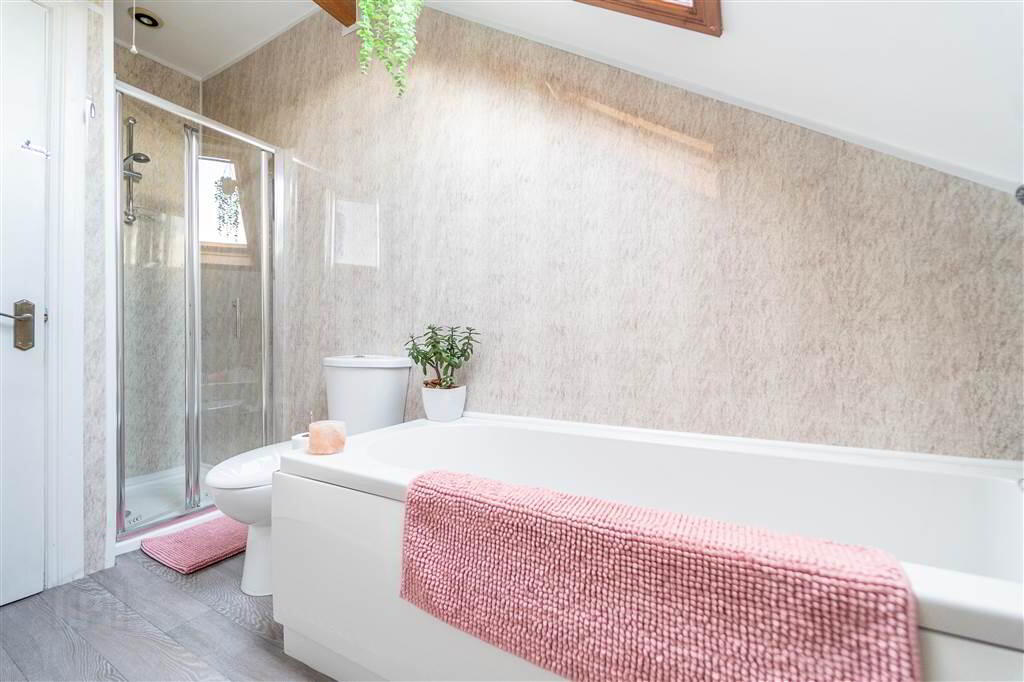 3.66m x 1.73m (12' 0" x 5' 8") Modern Bathroom with a white four-piece suite comprising a Panel Bath, a Push Button W.C., a Pedestal Wash Hand Basing and a Shower Cubicle with Electric Shower Unit. Complete with PVC Panel Walls.