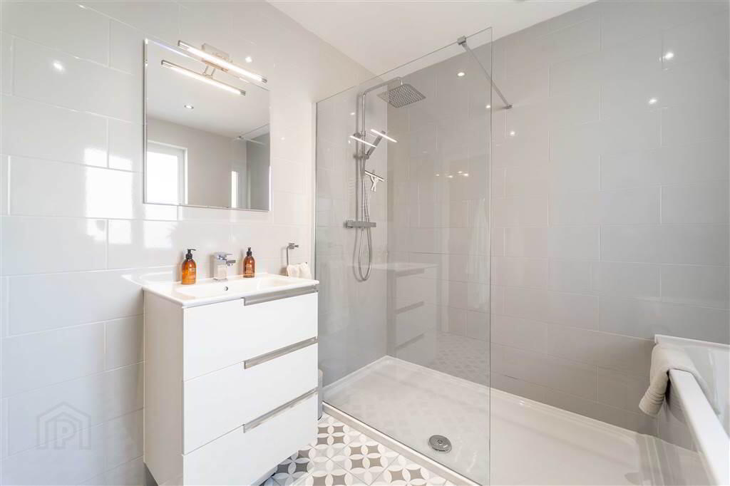 Four-piece Suite comprising a Bath, a walk-in Mains Rainfall Shower, a Low Flush W.C. and a Sink with Storage under. Complete with Tiled Flooring, part Tiled Walls, recessed Spotlights, an Extractor Fan and a Chrome heated Towel Rail.