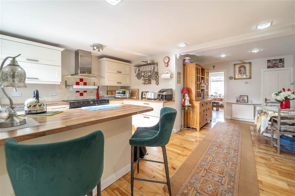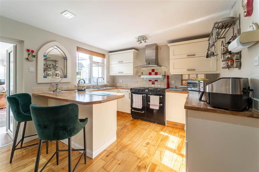 Contemporary Kitchen in a traditional style with a range of high and low level units with complimentary Laminate Roll-Edge Worktops extending into a Breakfast Bar. The Kitchen opens to provide ample space for dining with wooden floor throughout.