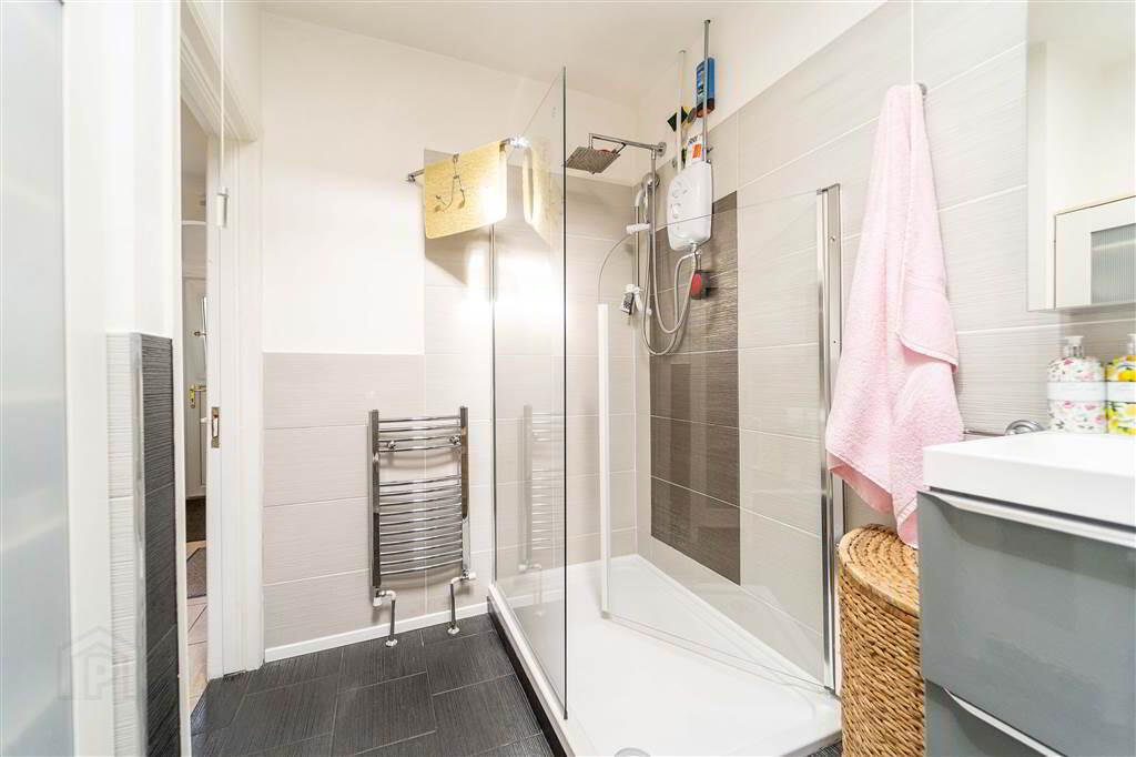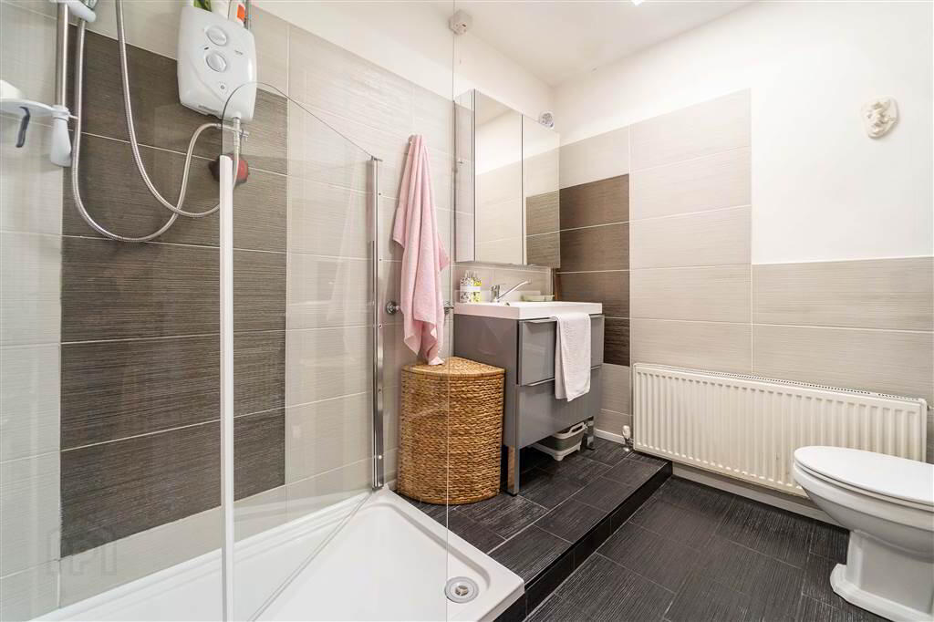 Contemporary Shower Room with a white three-piece suite comprising a tiled Shower Cubicle with Electric Shower Unit, a Wash Hand Basin with storage under and a W.C.. Complete with tiled floors and part tiled walls.