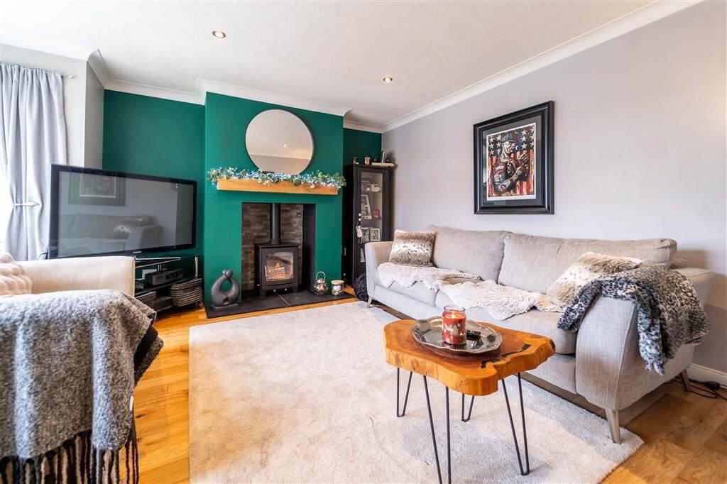 Front aspect Reception Room, leading into a Box Bay Window, with a feature Cast Iron Multi-Fuel Stove and complete with Wooden Flooring.
