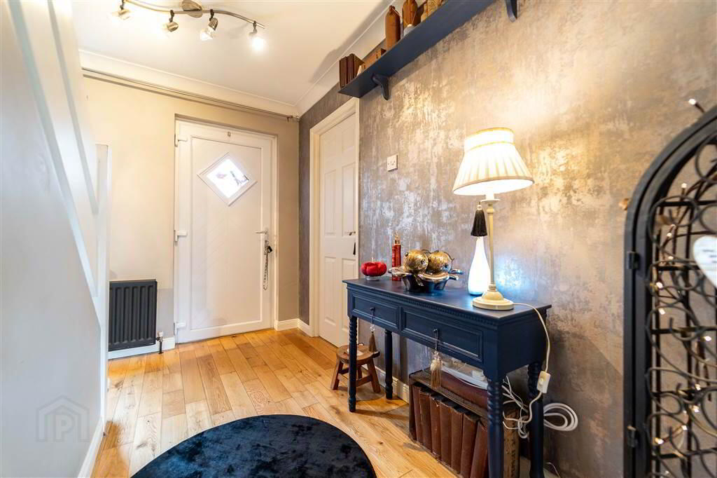Modern PVC Door leading into spacious Entrance Hall with Wooden Flooring.