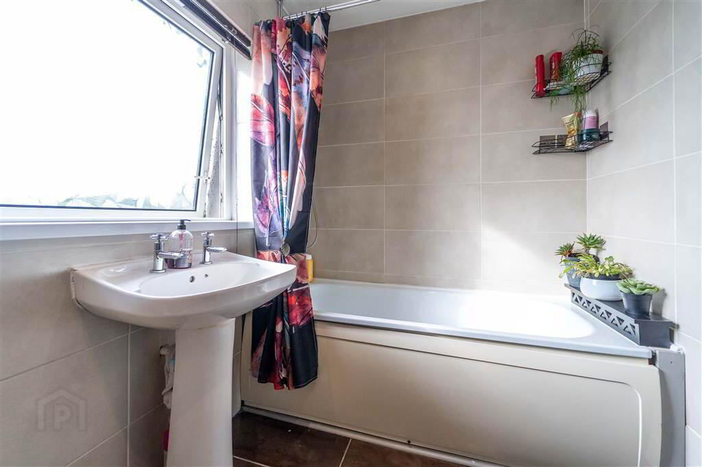 Fully tiled Bathroom with a white three-piece suite comprising a W.C., a Pedestal Wash Hand Basin and a Panel Bath with Mains Shower attachment.
