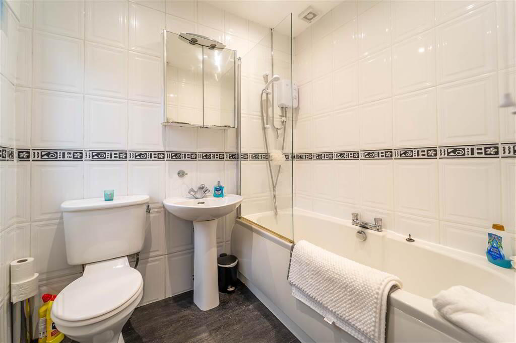 White three-piece suite comprising a Pedestal Wash Hand Basin, a W.C. and a Panel Bath with Electric Shower Unit. Complete with wall tiling.