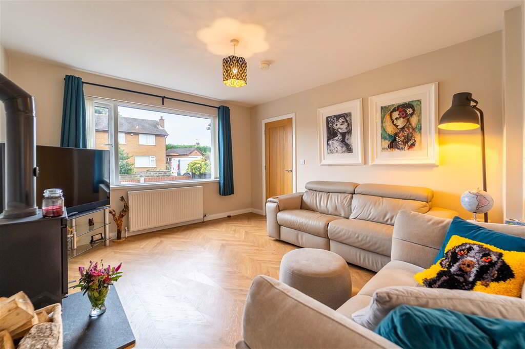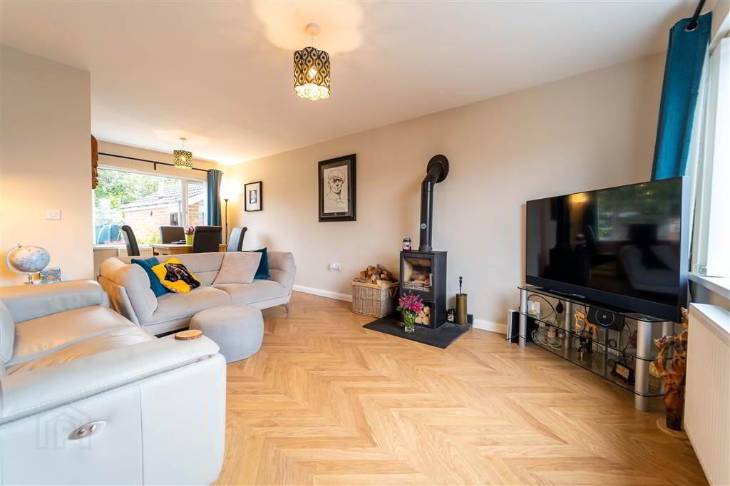 Spacious through aspect Reception Room with laminate wooden floor continued from the Entrance Hall. Feauture Wood Burning Stove. Open plan to: