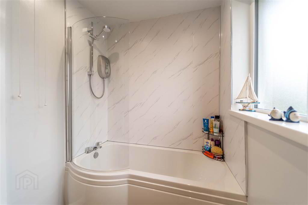 Modern Bathroom with a white three-piece suite comprising a wall mounted ‘floating’ Wash Hand Basin, a Push Button W.C. and a Panel Bath with Electric Shower Unit and PVC panelled walls.