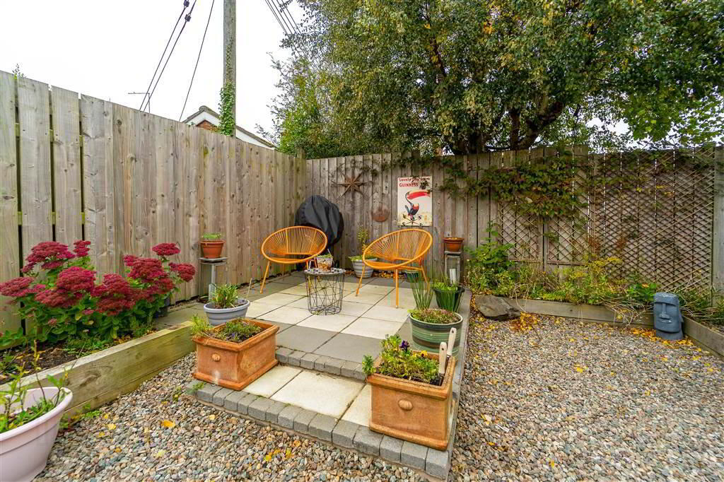 enclosed loose stone garden with flowerbed edging and a paved seating area.