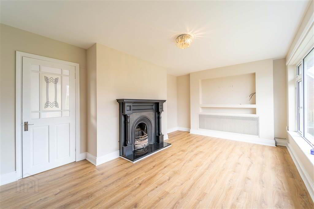 Front aspect Reception Room with a feature open Fire with a Cast Iron Surround, a Tiled Hearth and a Wooden Mantle. Complete with Laminate Wooden Flooring.