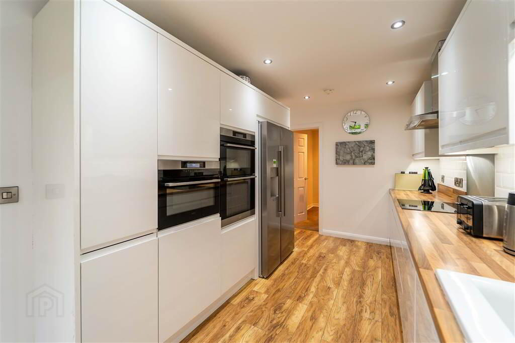 Modern fitted Kitchen with an excellent range of high and low level ‘high-gloss’ with complimentary Worktops. Integrated appliances include a Hob, 2x ‘eye-level’ Ovens, a Microwave / Oven, a Washing Machine and a Dishwasher. The Kitchen leads through to a further Dining Area. Laminate wooden floor through both areas.