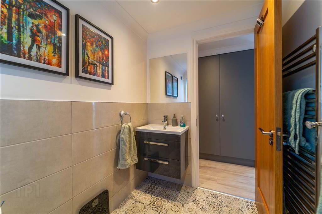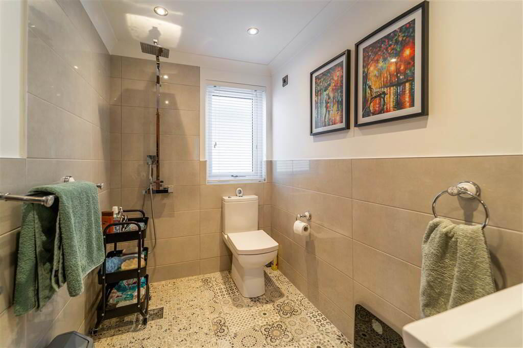 Contemporary styled Shower Room in a Wet-Room Design. Three-piece suits comprising a Mains Shower, a Push Button W.C. and a Wall-Mounted Wash Hand Basin with storage under. Complete with tiled floor and mostly tiled walls.