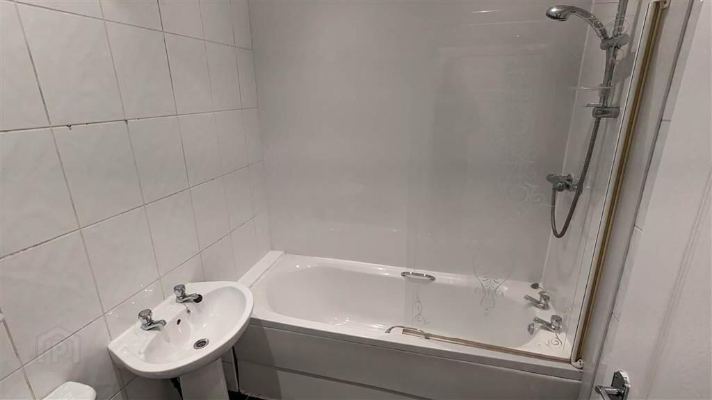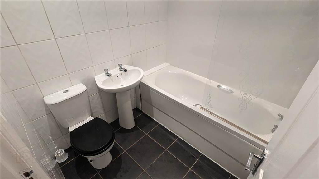Bathroom Modern Bathroom with white three piece suite comprising a Panel Bath with Mains Shower, a Push Button W.C. and a Pedestal Wash Hand Basin.