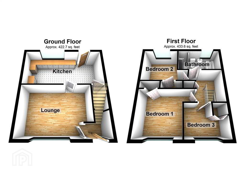 Internally, with a total area of approximately 860 sqft, accommodation comprises a spacious Lounge and Kitchen with Dining space on the Ground Floor with the First Floor offering three well-proportioned Bedrooms (each with built-in storage) and a Bathroom with a four-piece suite.