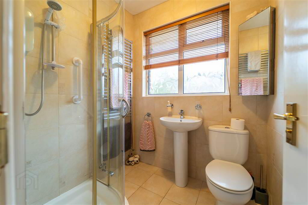 Three-piece Suite comprising a Pedestal Wash Hand Basin, a Low Flush W.C. and a Corner Shower with a Redring Electric Shower over. Complete with Tiled Flooring, Tiled Walls and a Chrome Heated Towel Rail.