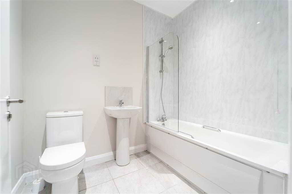 White three-piece suite comprising a tile-surround Panel Bath with Shower Attachment, a Pedestal Wash Hand Basin and a Push Button W.C.. Complete with tiled flooring.