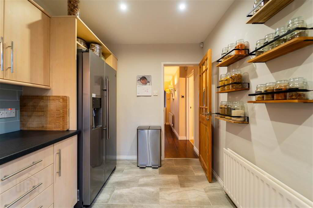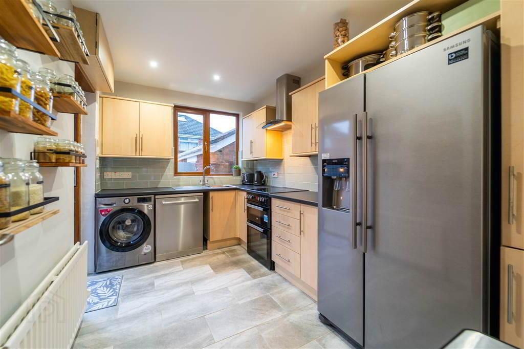 Fitted Kitchen with a range of high and low level units with complimentary worktops and a Stainless-Steel Sink Unit. Plumbed for a Washing Machine, a Tumble Dryer and an ‘American’ Style Fridge / Freezer. Complete with tiled floor and part tiled walls. Access to Rear Garden.