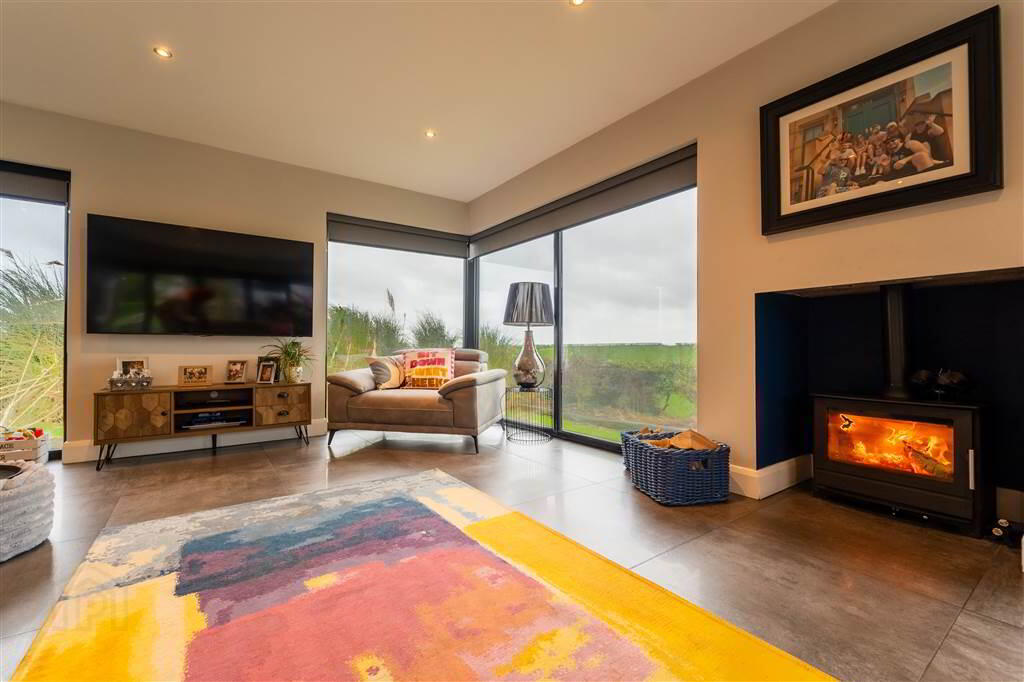 Luxury fitted high-gloss Kitchen, with complimentary Worktops and a matching Island Unit topped with Quartz. Integrated appliances include an Oven, a Hob and a Dishwasher. The Kitchen is open plan into an extended Living / Dining space, with a feature Cast Iron Multi-Fuel Stove which has been cleverly designed with multiple ‘full-length’ windows to enjoy the countryside views. Folding doors also lead to the Rear Patio Area creating an ideal place to relax or entertain. Tiled flooring throughout.