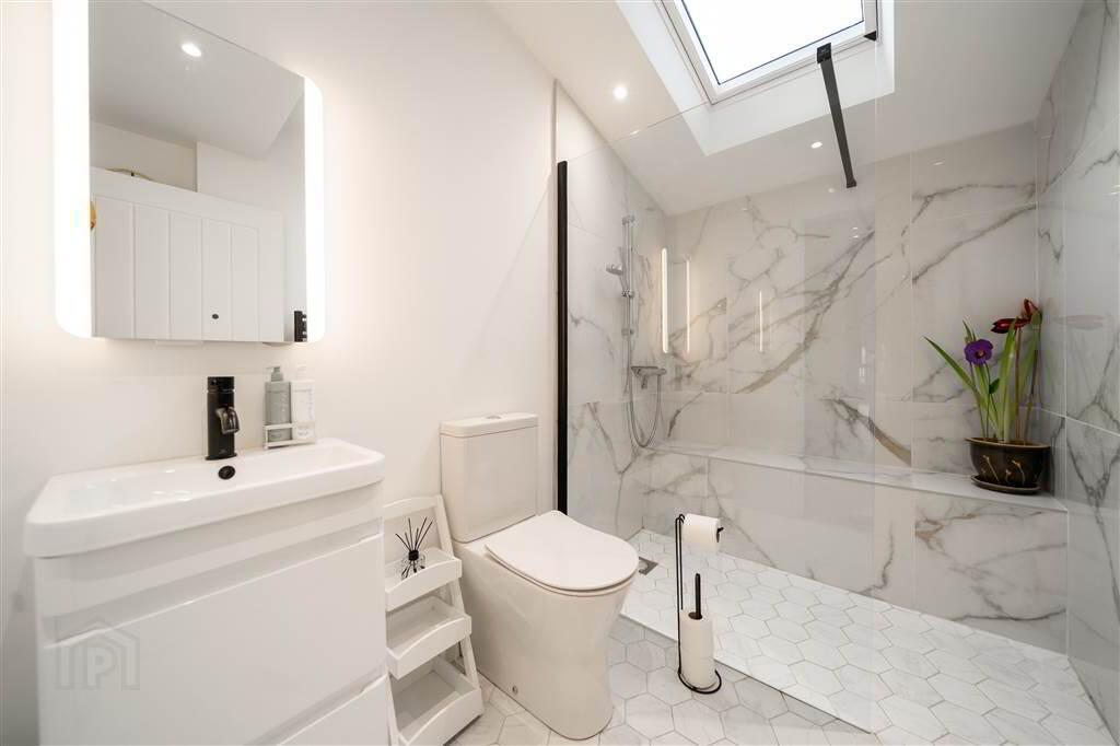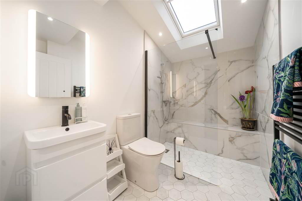 Deluxe three-piece Suite comprising a walk-in Mains Shower, a Low Flush W.C. and a Sink with storage under. Complete with Tiled Flooring, part Tiled Walls. A heated Towel Rail, recessed Spotlights and a feature Velux Window.