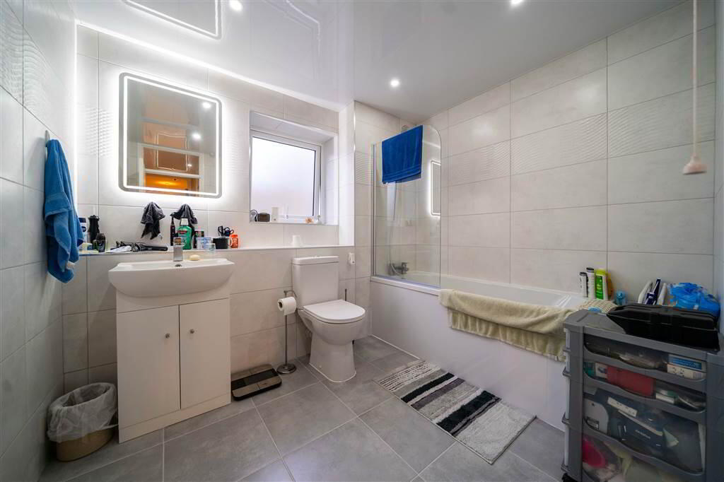 Modern white three-piece suite comprising a Push Button W.C., a Wash Hand Basin with cupboard storage under and Panel Bath with Shower Attachemnt. Complete with floor and wall tiling.