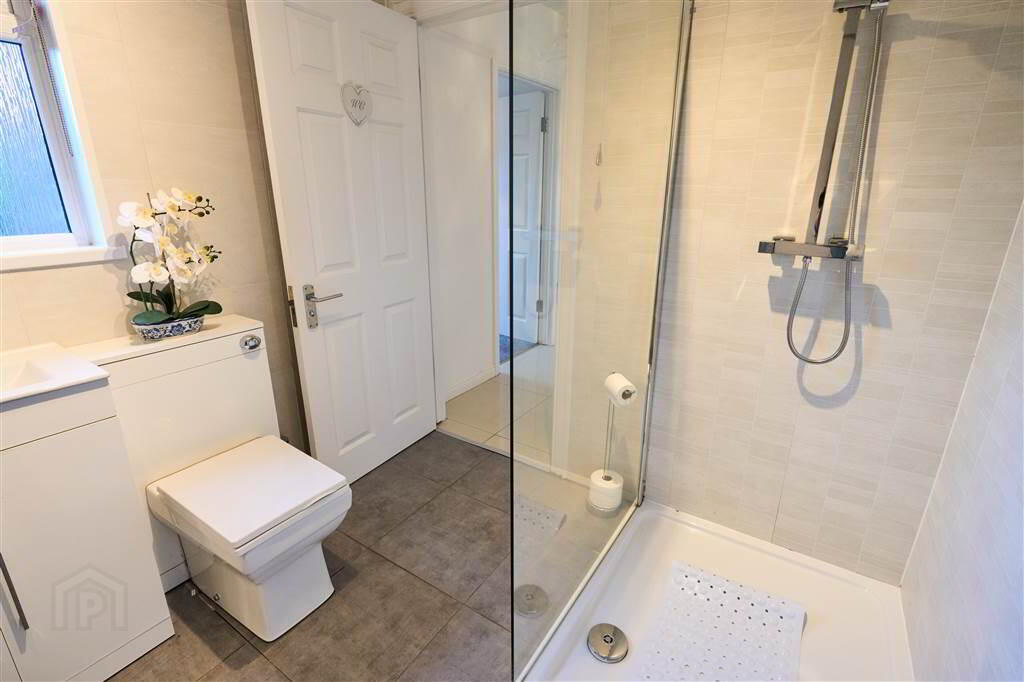 Deluxe fitted three piece Shower Room comprising a Walk-In Shower Cubicle with Mains Shower, a Push Button W.C. and Wash Hand Basin with Storage Under.