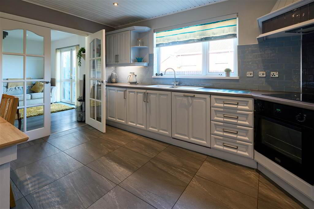 Fitted Kitchen with an excellent range of high and low level units with complimentary worktops, an integrated Dishwasher and a Hob with Oven under. Complete with tiled flooring and offers dining space.