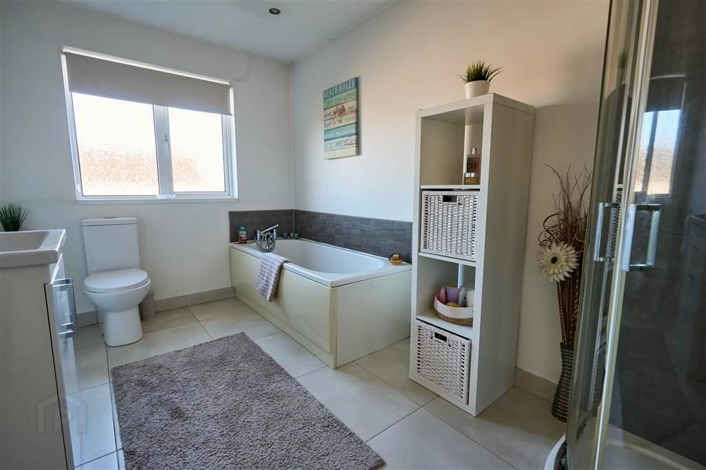 Modern Bathroom with a white four-piece suite comprising a Panel Bath, a Push Button W.C. a Wash Hand Basin with Storage under and a tiled corner Shower Cubicle with Electric Shower Unit. Complete with tiled flooring.